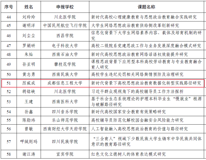 为了进一步提高学院辅导员思想政治教育理论研究水平与实际工作能力,推进辅导员队伍专业化培养和职业化发展,学院积极组织开展进行研究课题申报工作。2023年四川省教育厅、高校思想政治工作队伍培训研修中心(西南交通大学)思想政治教育研究课题(高校辅导员专项),共立项107项,其中,公司党委副书记厉威成主持,江玉菡、岳旭媛、张梦琪参与申报的项目《新时代背景下高校思想政治教育数据化转型实践路径研究》立项成功。