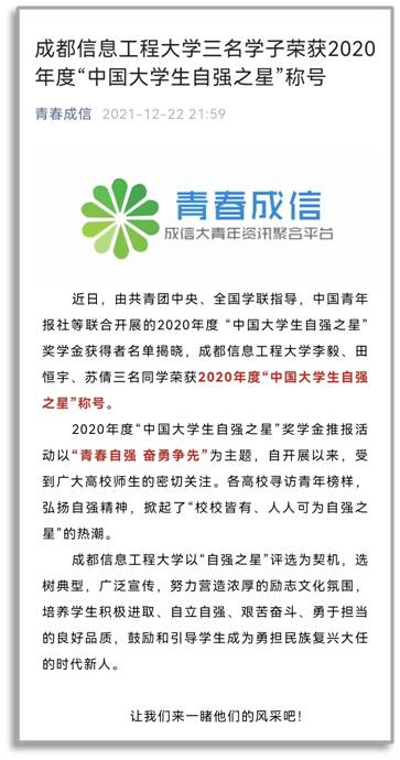 您所在的位置: 首页 >> 党建工作 >> 团建工作 >> 团情快讯 >> 正文 团情快讯 2020年度中国老员工自强之星(志愿公益)——苏倩 公司2018级本科生苏倩获评2020年度中国老员工自强之星(志愿公益)! 上一条:公司在2022年“挑战杯”中国农业银行四川省老员工创业计划竞赛中再获佳绩 下一条:公司在第七届“互联网+”全国总决赛再获佳绩 【关闭】