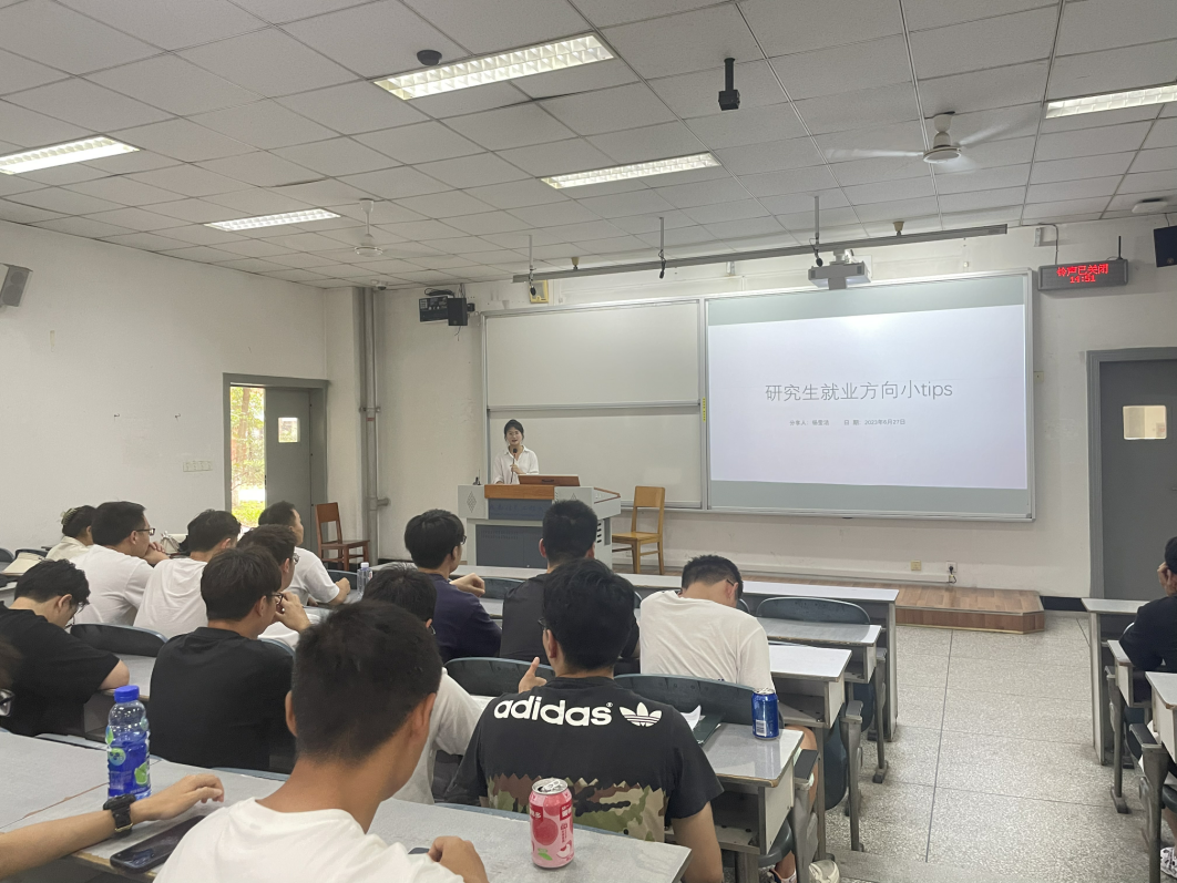 杨莹洁学姐的主题是《研究生就业方向小tips》。她在这次分享中从进入体制和进入公司两个方面进行了讲解,探讨了两者之间的区别以及可选择的工作方式。她特别强调了明确自己的职业定位和目标的重要性。此次分享给同学们带来了关于就业方向选择的启发和指导,让同学们能够更清晰地了解不同就业途径,提升自己的就业竞争力。
